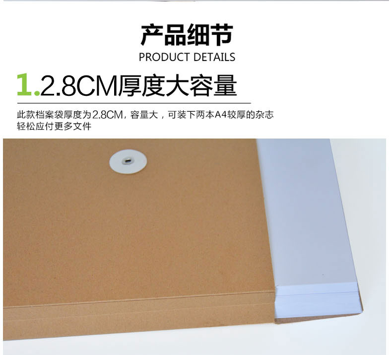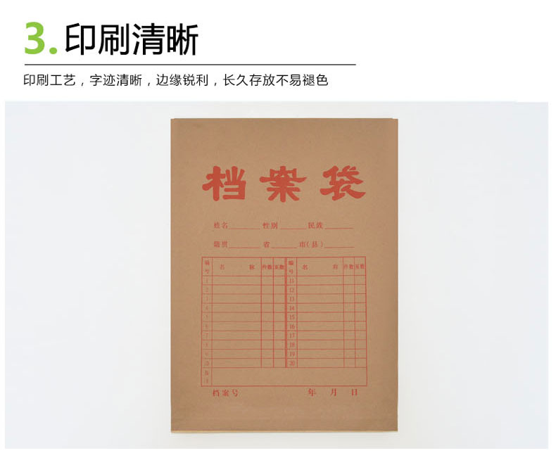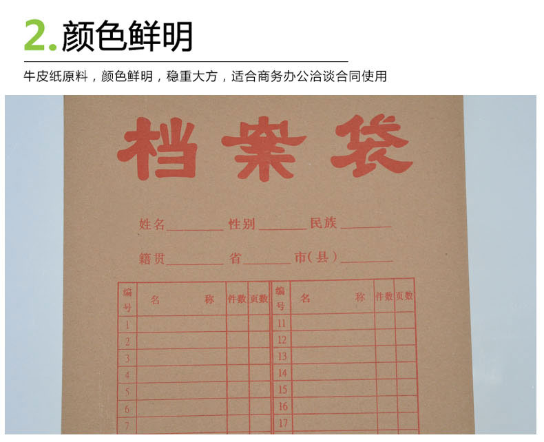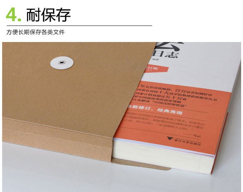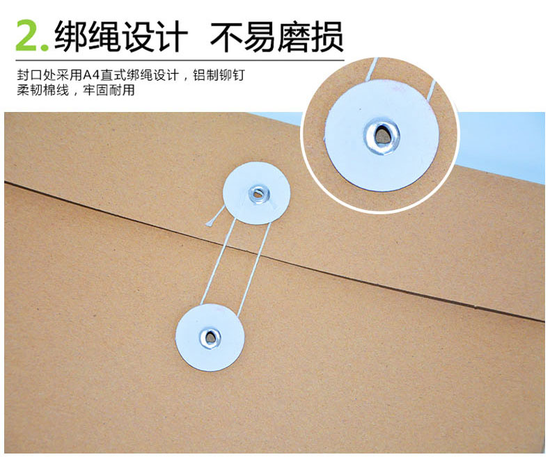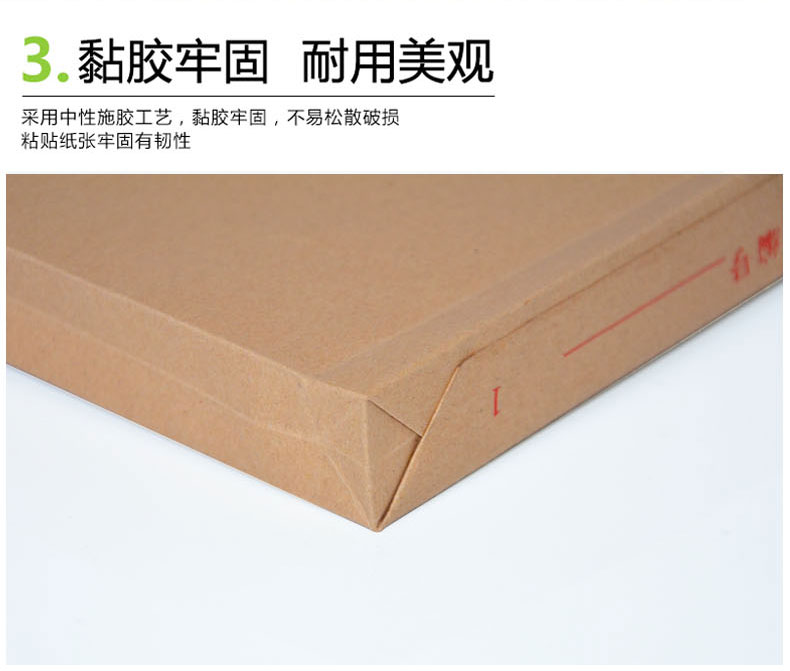 封口處采用A4直式綁繩設計,鋁制鉚釘,柔韌棉線,牢固耐用; 采用中性施膠工藝,黏膠牢固,不易松散破損、粘貼紙張牢固有韌性,方便長期保存各類文件。
